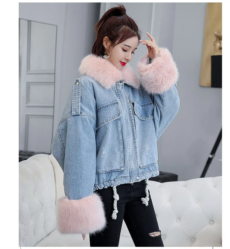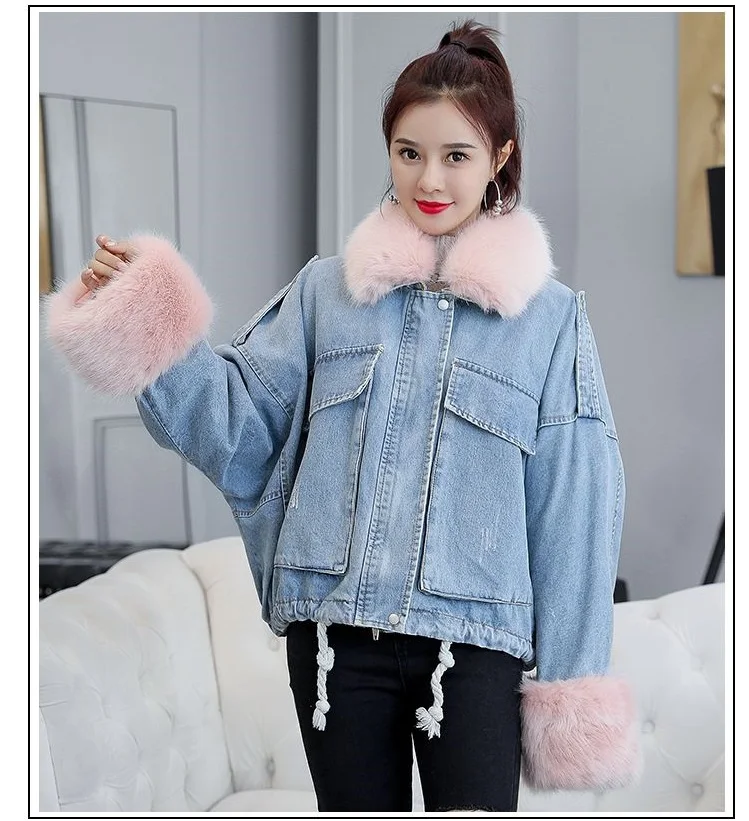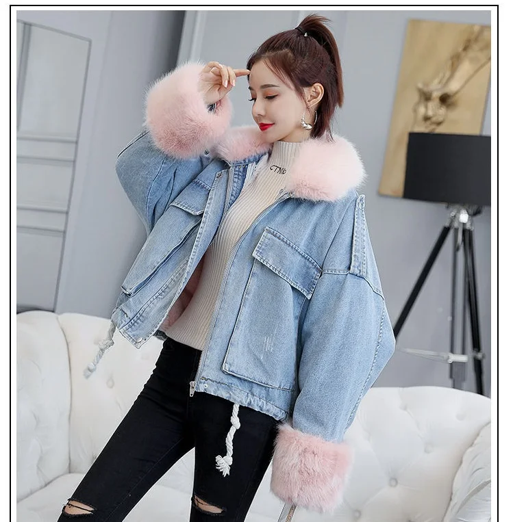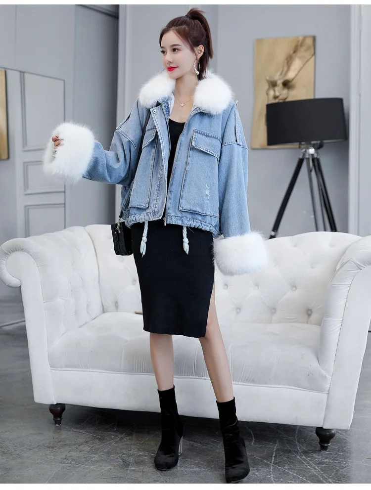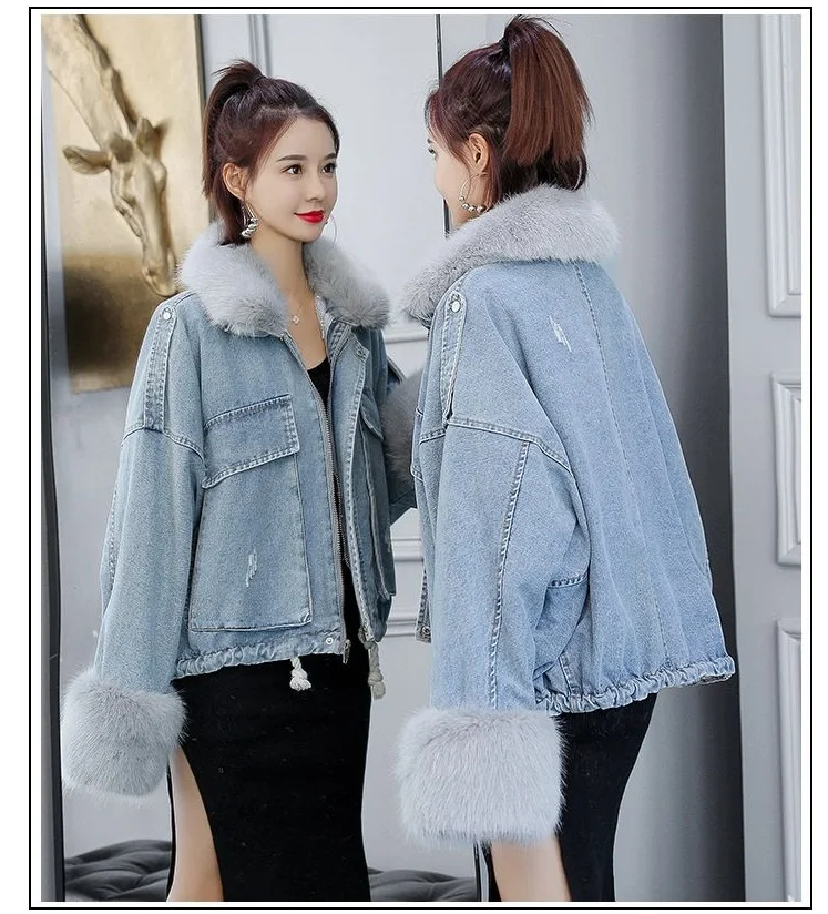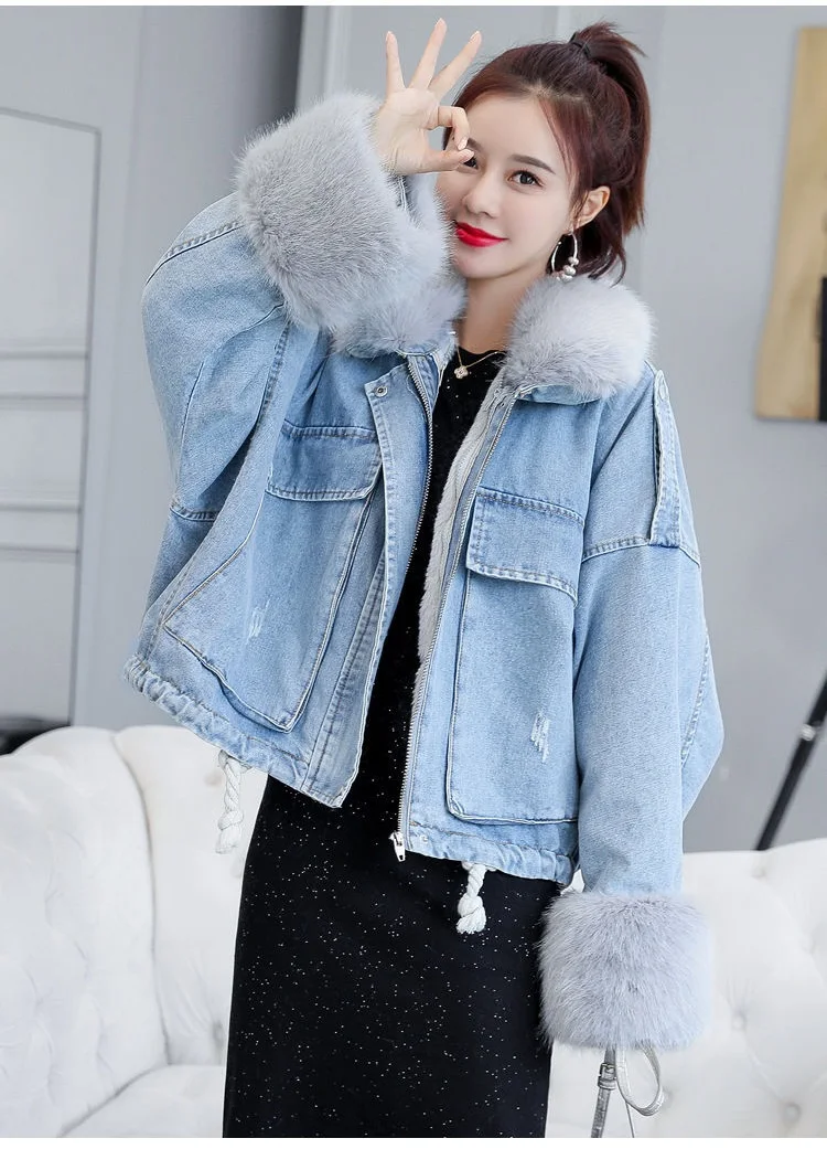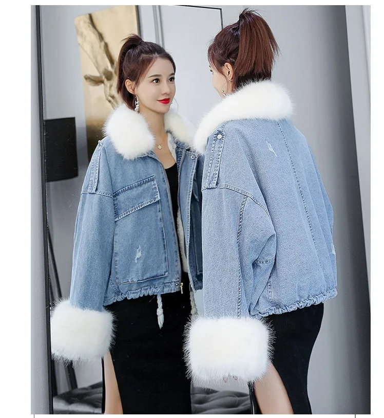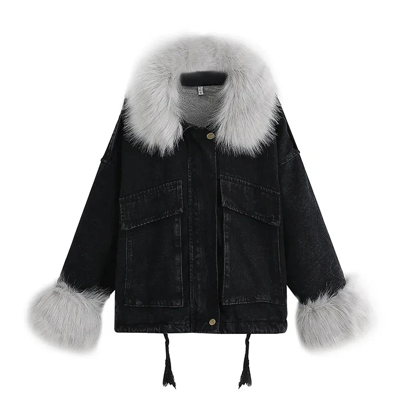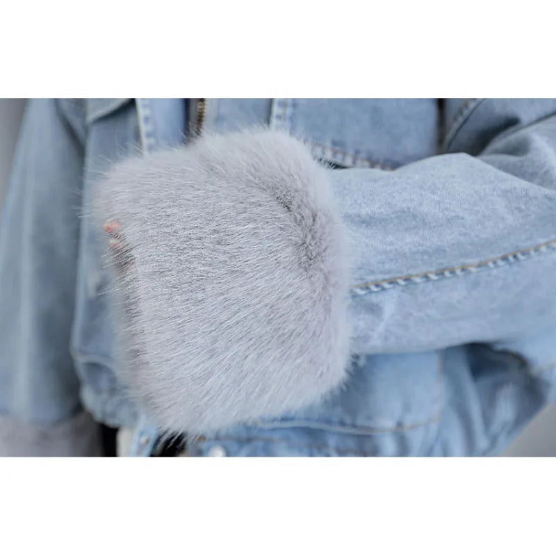 Stay warm in style with this loose-fit denim jacket featuring a plush wool collar and cozy velvet lining. Perfect for layering over knits or basics for an effortlessly chic autumn-winter look.