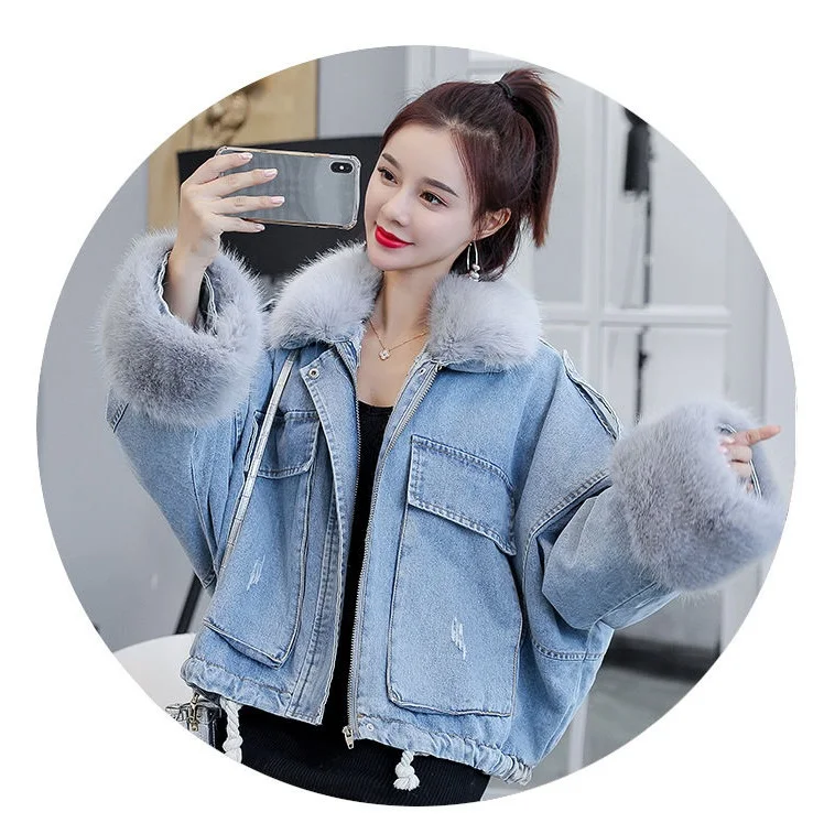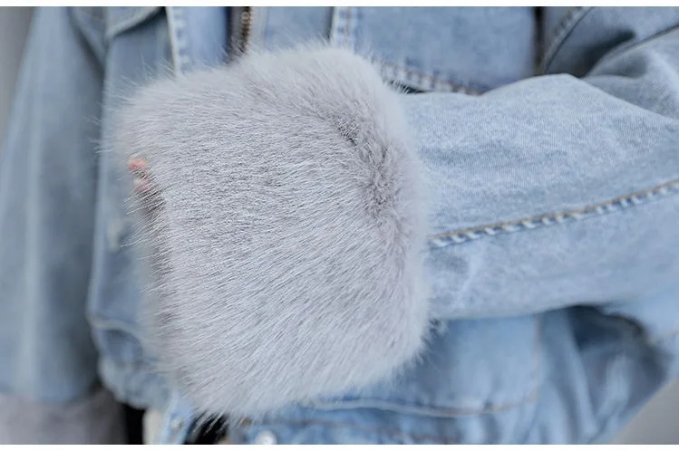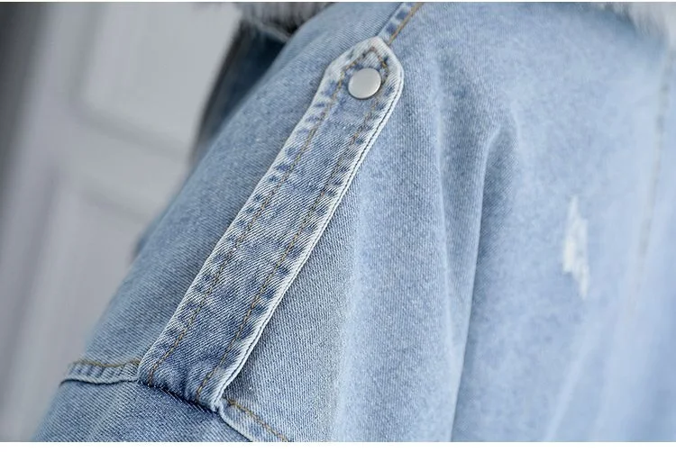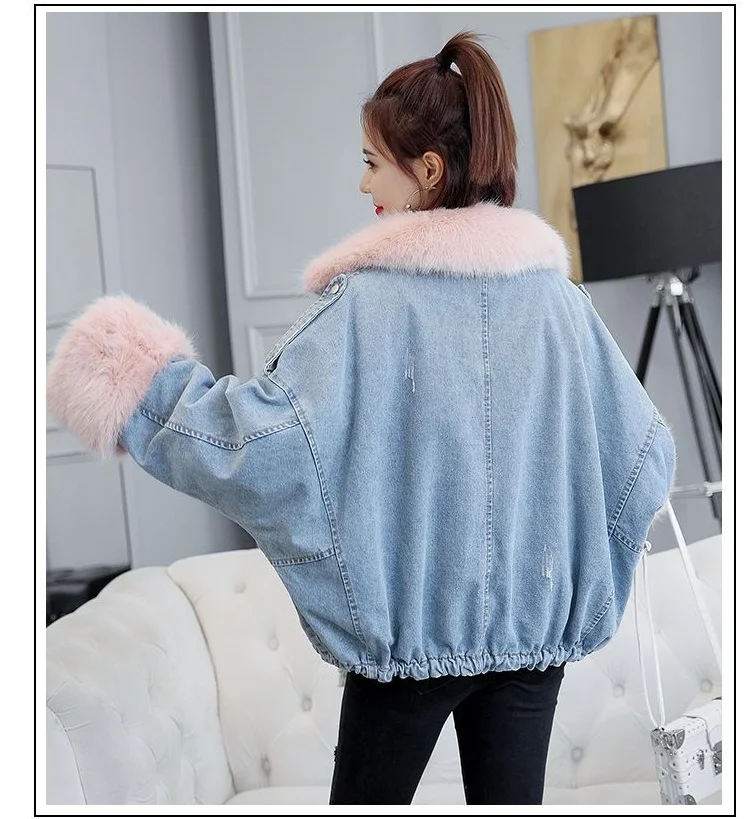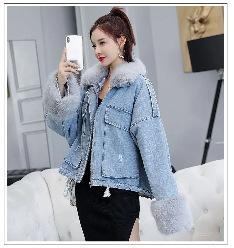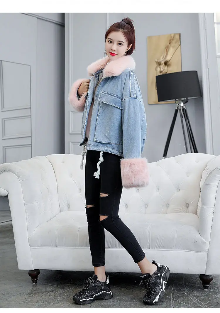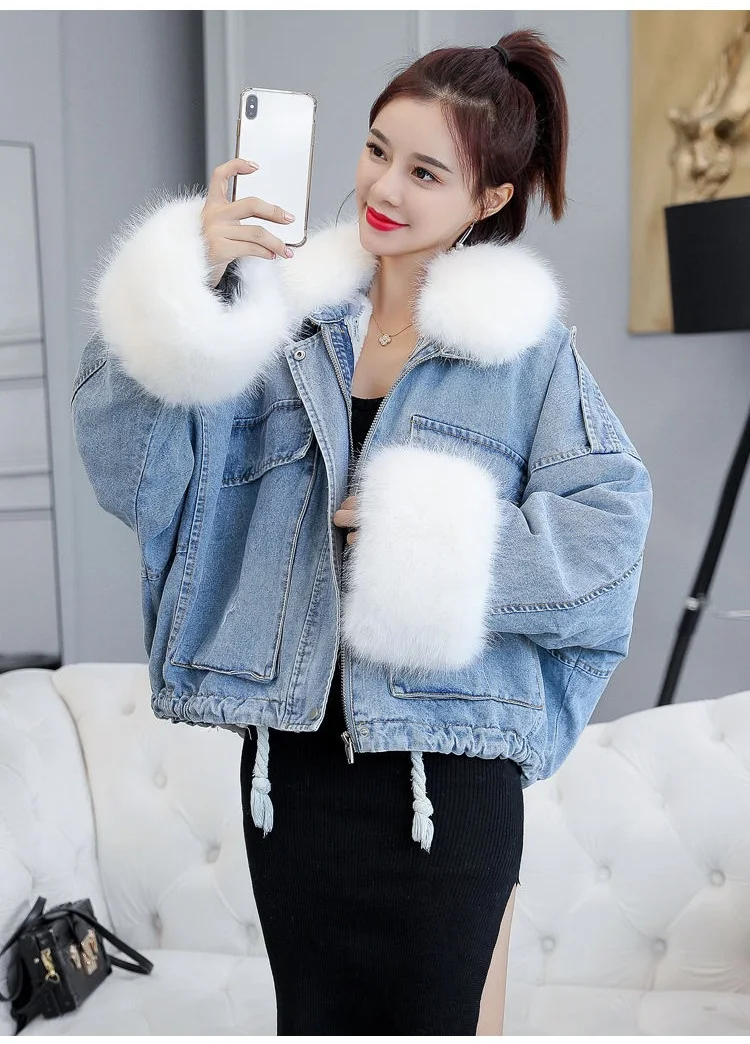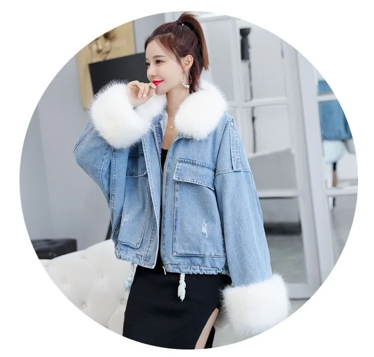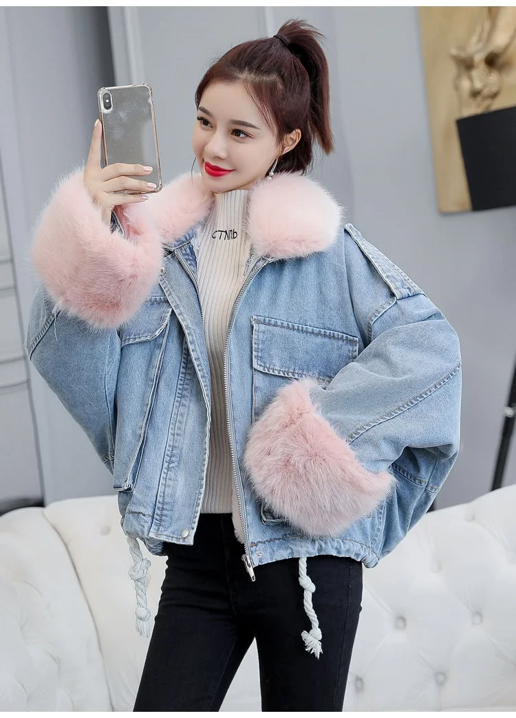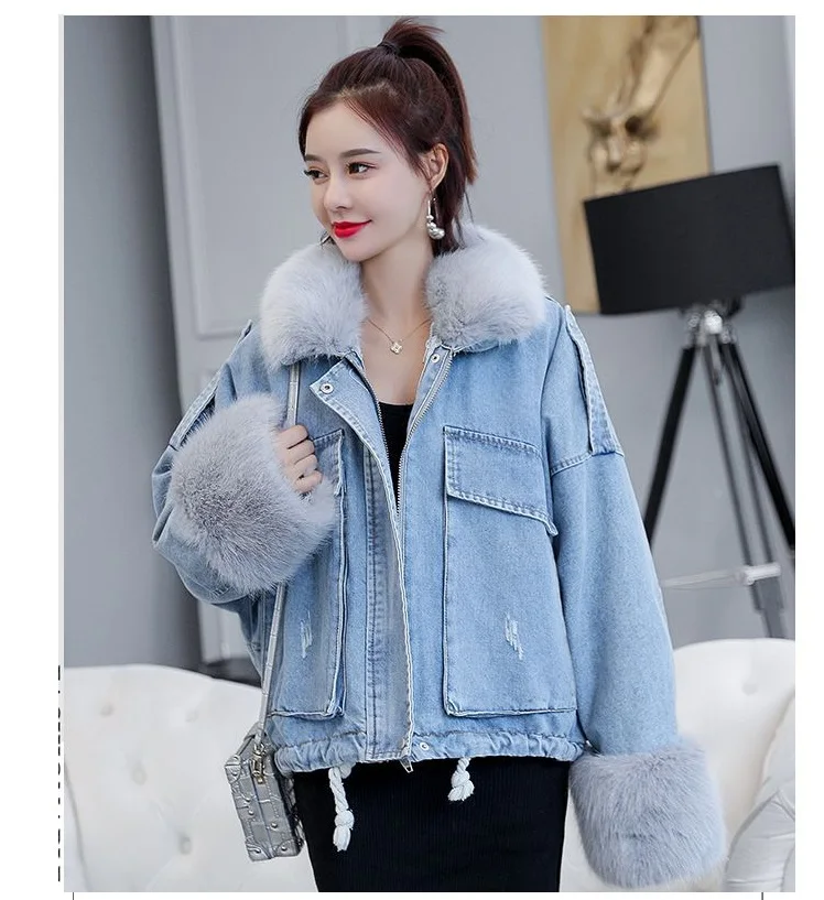 Stay warm in style with this loose-fit denim jacket featuring a plush wool collar and cozy velvet lining. Perfect for layering over knits or basics for an effortlessly chic autumn-winter look.