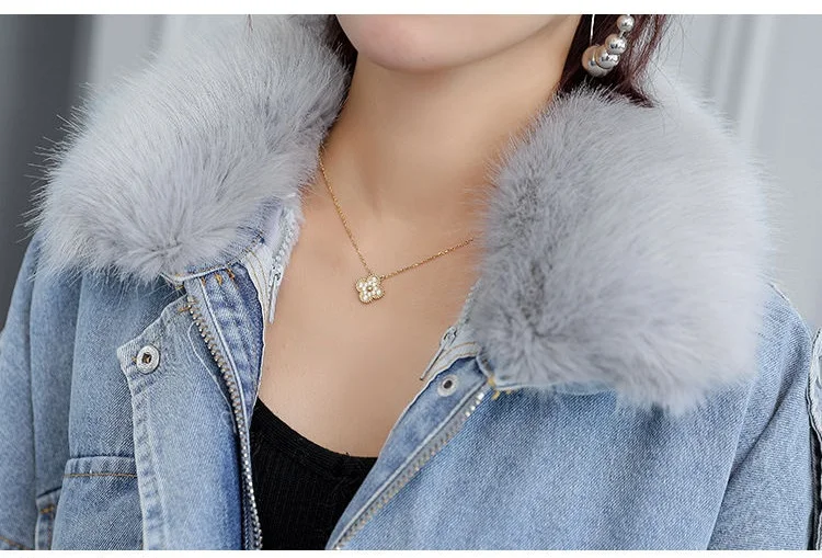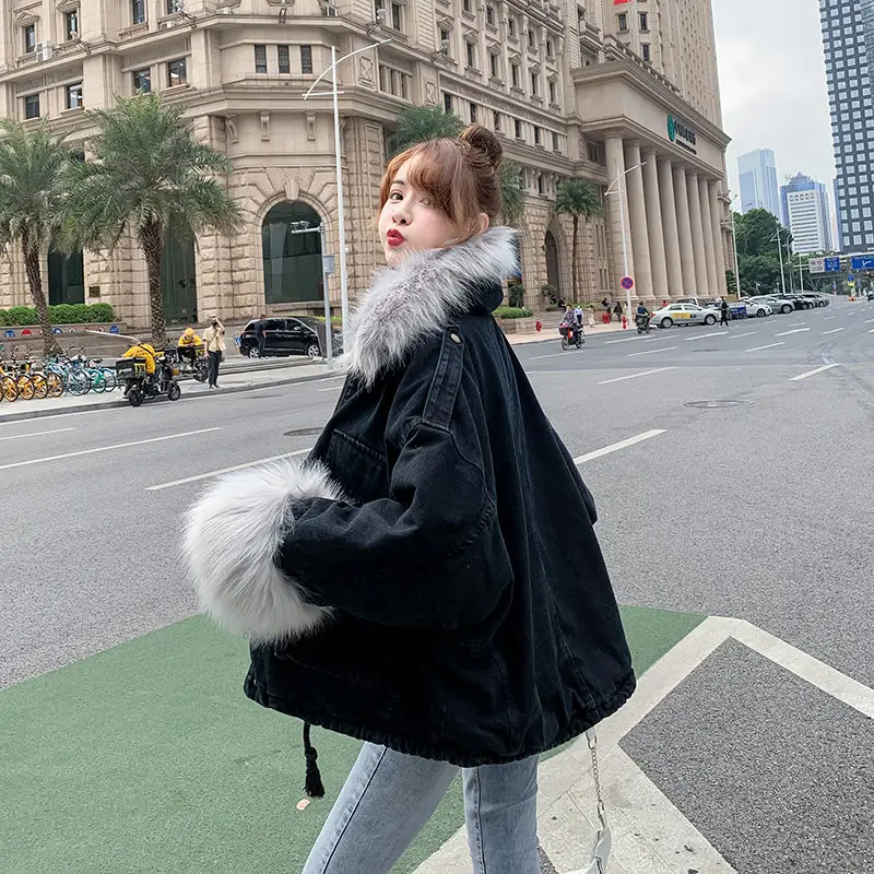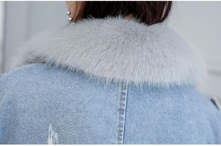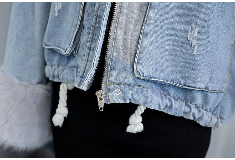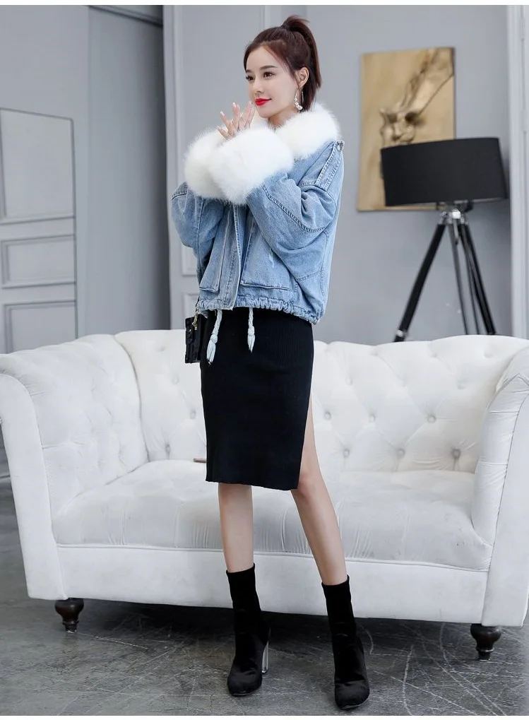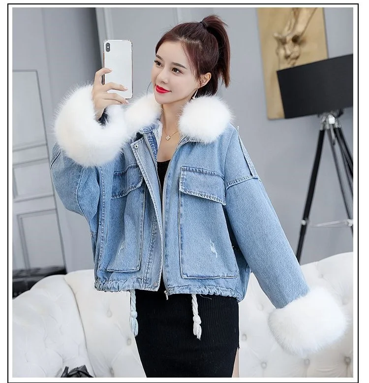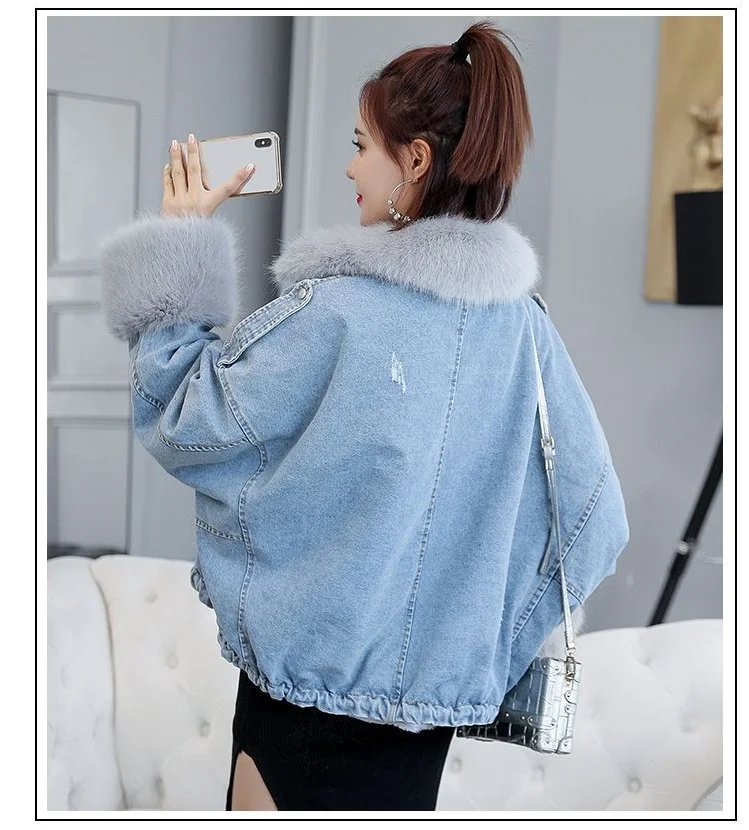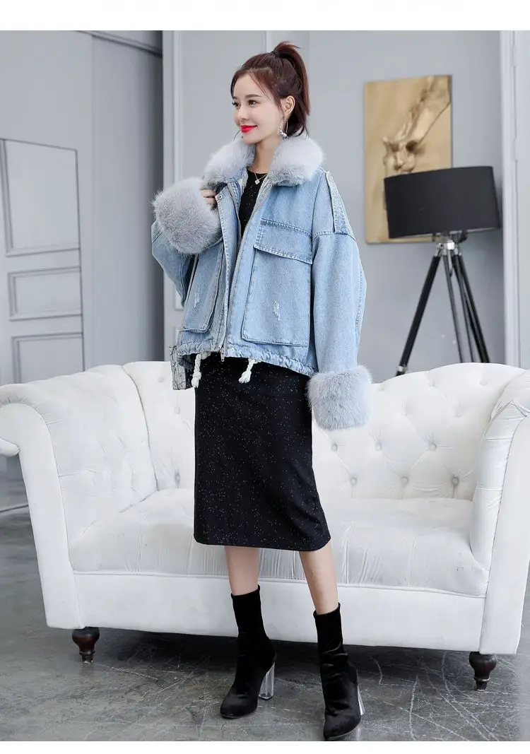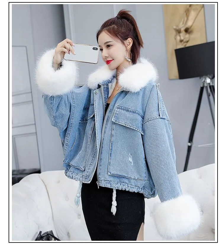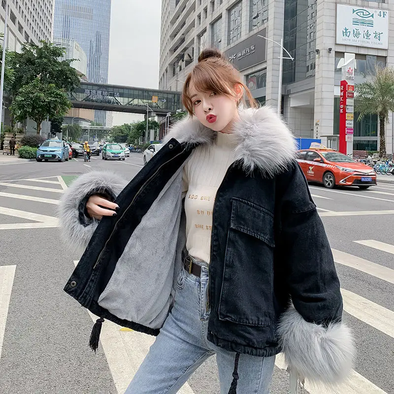 Stay warm in style with this loose-fit denim jacket featuring a plush wool collar and cozy velvet lining. Perfect for layering over knits or basics for an effortlessly chic autumn-winter look.